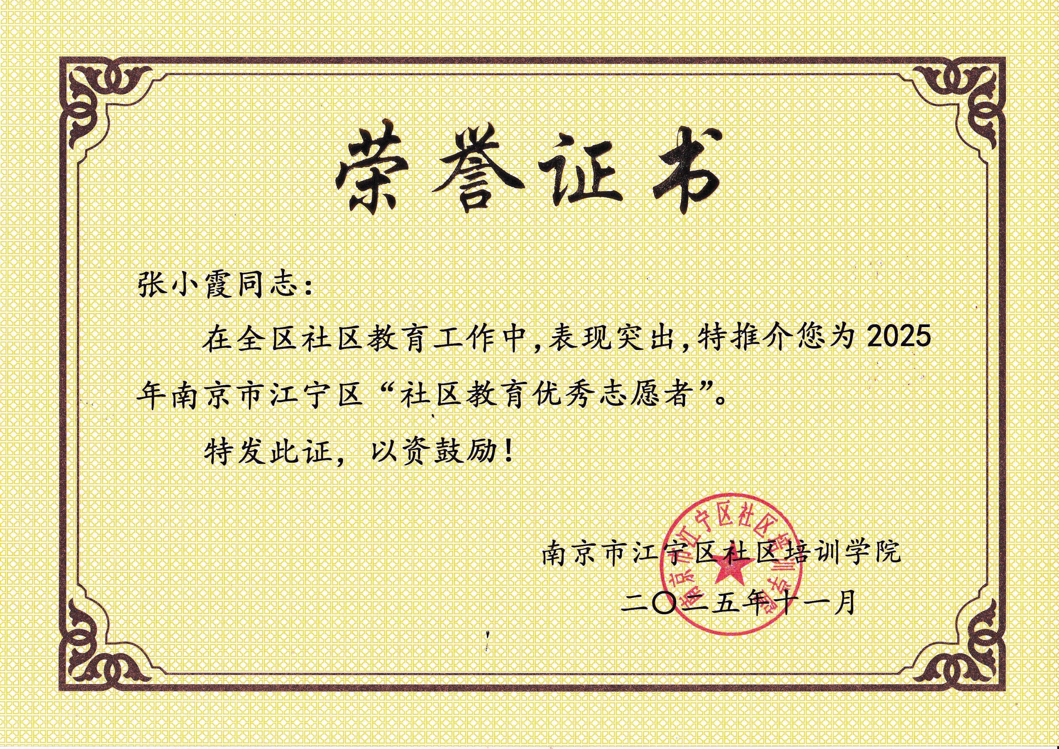 下载:20251118:(20251100)2025年南京市江宁区“社区教育优秀志愿者”-张小霞.pdf